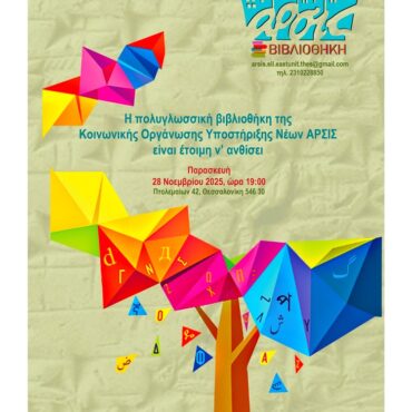 Πολυγλωσσική Βιβλιοθήκη δημιουργήθηκε στον φιλόξενο χώρο της ΑΡΣΙΣ με το όραμα να λειτουργήσει ως πόλος γνώσης, διάδρασης και πολιτισμικής συμπερίληψης κι εγκαινιάζεται με ένα πλούσιο πρόγραμμα εργαστηρίων Πρόγραμμα Εκδήλωσης – Η ιστορία της γραφής Έκθεση για την ιστορία της γραφής και την εξέλιξη του αλφαβήτου. – Πολυγλωσσική Βιβλιοθήκη Παρουσίαση της βιβλιοθήκης της ΑΡΣΙΣ: λόγοι δημιουργίας, σημασία και προοπτικές. – Poetry without Borders Έφηβοι, εθελοντές και εργαζόμενοι των ΕΔΗΔ και της ΑΡΣΙΣ διαβάζουν ποίηση στη μητρική τους γλώσσα, με παράλληλη απόδοση […]